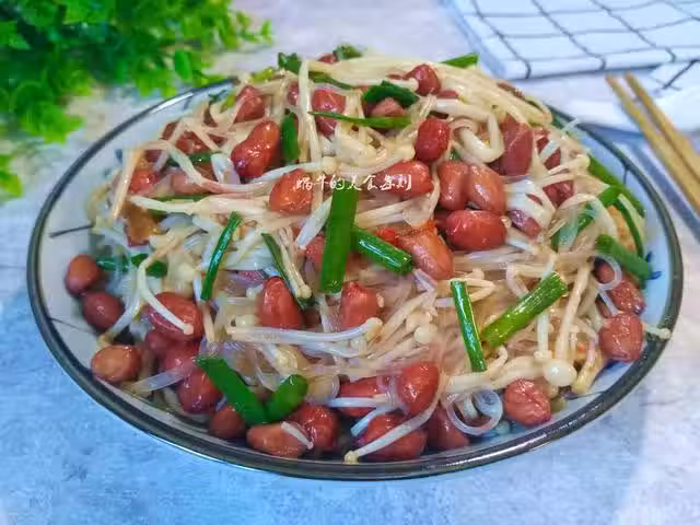 粉絲瀝干水分和金針菇一起放入小盆,加入蔥段和蒜末,接著熬少許花椒油,潑到蒜末和蔥段上激出香味,然後放入花生米。
