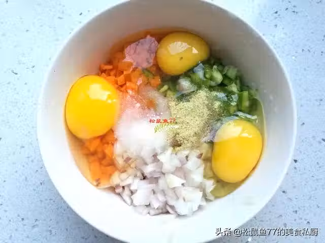 3、大碗內加入1勺鹽、1小勺胡椒粉,再打入3個雞蛋,用筷子混合攪拌均勻。