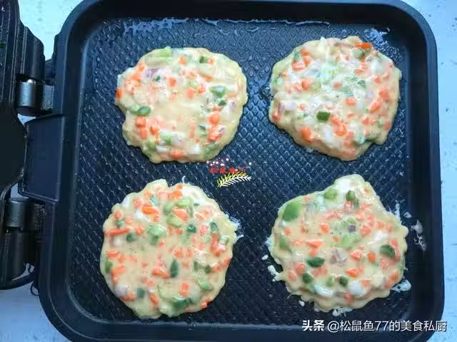 6、電餅鐺預熱,用刷子薄薄的刷上一點點食用油,用勺子舀一勺麵糊放入電餅鐺內,用勺子背面輕輕攤成小圓餅的形狀,先不要蓋蓋子,防止表現粘連。沒有電餅鐺也可以用平底鍋烙,一樣的。