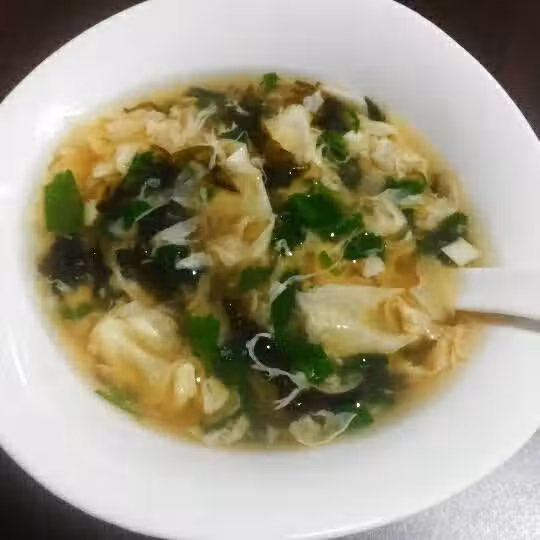 倒入少許一品鮮醬油,少許雞汁調味,放入撕碎的紫菜(金針菇,豆腐,黃瓜片,西紅柿等隨意放),煮開