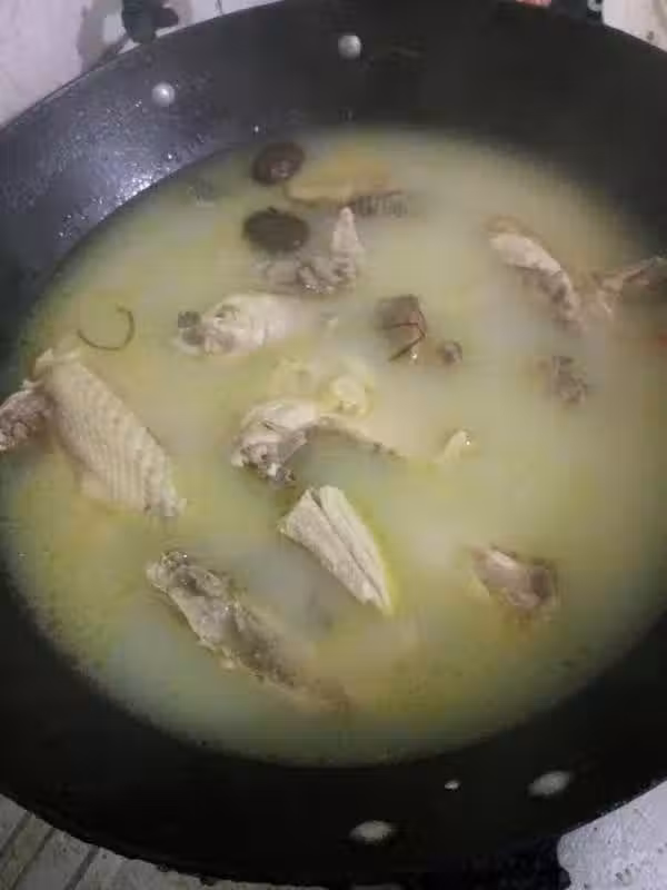 鐵鍋洗淨,加入油,放入生薑、蔥煸炒至散發蔥香,將雞塊推入翻炒幾下,加入料酒(也可以用黃酒哦)和水(水要足夠多,一直到熬好湯為止,中途都不要再加水哦)。