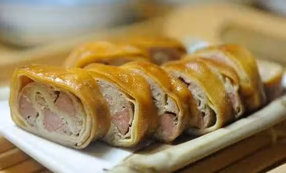 肉餡鋪在干豆腐上,在鋪好的肉餡上,等距離地放幾條火腿腸