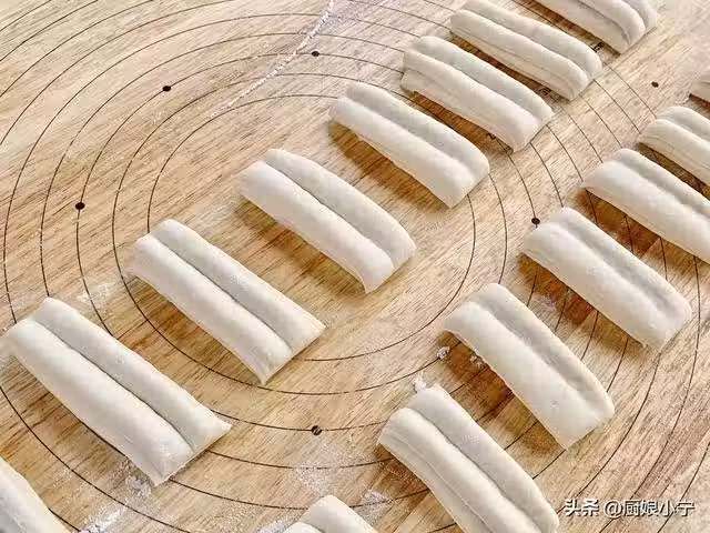 5,現在的形狀就和大街賣的炸油條差不多了,直接兩手一抻一扭,下鍋。但是敲重點來啦,咱做的可是嘟嘟唇國宴小油條。再說家裡鍋那麼小,還是做小的更方便。用刀給它對切一下,讓每個劑子變成十厘米左右的長度。再把兩個邊用手捏緊。讓它再炸的時候不會分開。