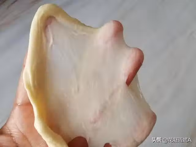4、取一小塊麵糰,用手一拉,可以輕鬆地拉出這樣的手套膜就行了,麵糰放到溫暖處發酵,我們都是在家裡做麵包,可能大多數人沒有發酵箱,因為麵糰發酵需要溫度和濕度,我們可以把麵糰蓋上保鮮膜放到烤箱裡發酵,放上一碗熱水,這樣就有水蒸氣了,發好的麵糰水分流失也小一些。