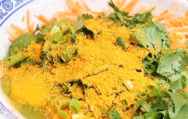 腌好的胡蘿蔔土豆絲攥干水分,倒入切好的蔥花香菜,打入兩個雞蛋,加入一把麵包糠吃起來更加的酥脆,用筷子攪拌混合均勻。