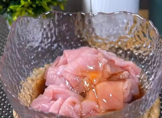 準備好一塊豬裡脊肉切成片裝入碗中,加入料酒,生抽,食鹽,蛋清沿著一個方向攪拌均勻。