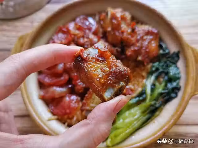 [準備材料]:排骨300克,家樂拌飯醬2包,金龍魚小鮮米一罐(可做三份煲仔飯),青菜2根,生薑1小塊,生抽1勺,澱粉1勺,蚝油1勺,香腸半根,雞蛋一個(可不放)。