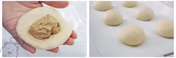 5、 二發時準備酥皮:黃油室溫軟化,依次加入過篩的糖粉、常溫蛋液(分次)、過篩的低粉,每次攪勻後再加下一項。最後再加入用幾滴沸水+咖啡粉兌出來的咖啡液,拌勻;