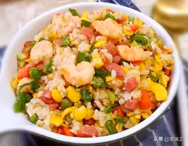 7、加入青豆胡蘿蔔玉米粒,再加入火腿蝦仁翻炒均勻。
