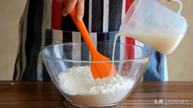 【製作方法】第一步、先來準備糯米麵皮的部分,準備一個大碗,碗中加入糯米粉,玉米澱粉,砂糖。邊攪拌邊倒入牛奶,等牛奶全部加進去的時候,用手抽把糯米粉糊攪拌到均勻沒有顆粒就可以。