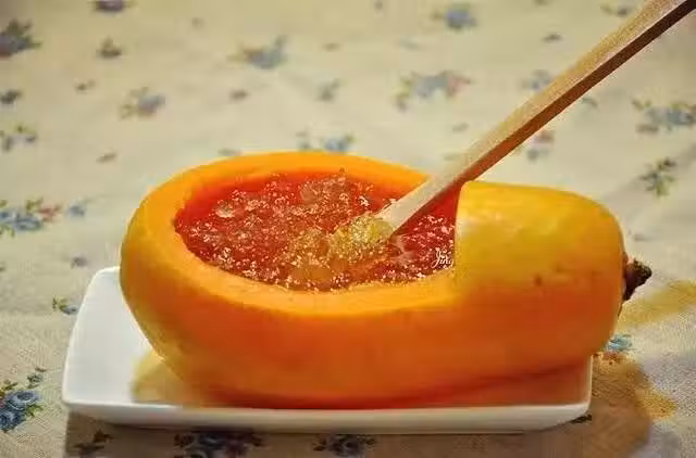 蒸好的桃膠倒進挖好洞的木瓜里,下適量冰糖再蒸二十分鐘。