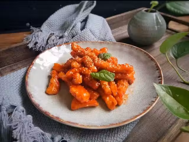 食材準備:裡脊肉半斤、黑胡椒粉適量、生薑1塊、蕃茄醬2勺、白糖1勺、白酒半勺、食鹽適量、澱粉適量、泰式甜辣醬3勺、熟芝麻適量