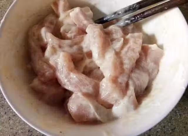 步驟5.鍋中放入適量的食油,然後把腌制好的裡脊條放進去小火炸制微定型,