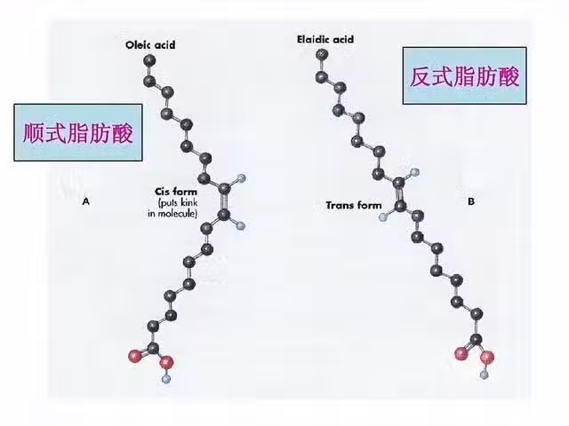 而這條線並不是直的,而是折線形,將這條線折上三次,就可以得到一條折線。如果折線的兩端在不同一個方向,那麼這就是反式脂肪酸。而與反式脂肪酸相對的,則是順式脂肪酸,其分子結構就是折線的兩端在同一個方向的結構。