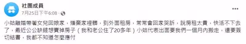 住婆家20多年被趕走,小姑失婚回家哭窮,公公大動作賣房還逼簽切結書,要求1個月搬走夫妻倆傻眼
