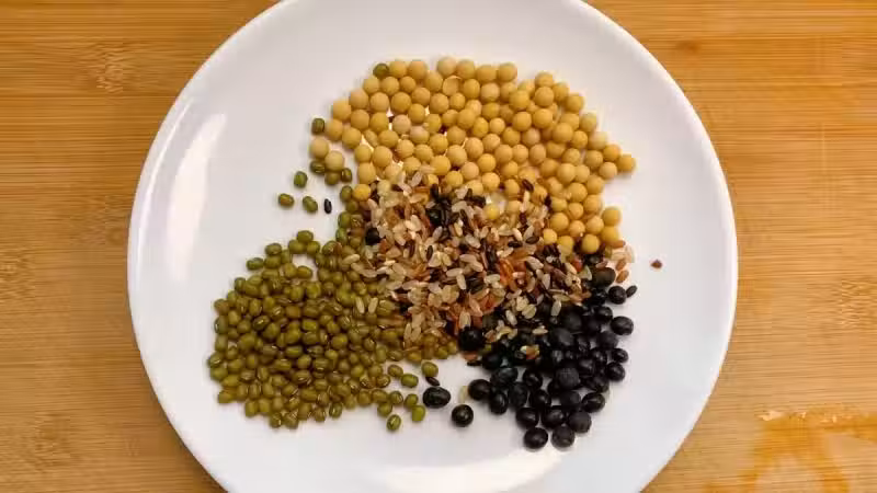 【雜糧粥】 所準備的食材有:黃豆2兩、黑豆2兩、綠豆2兩、紅豆2兩、三色糙米3兩、白糖適量