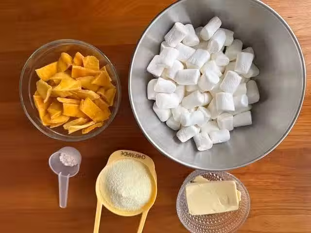 1、今年非常受歡迎的芒果奶糕。主要材料是棉花糖和芒果乾,芒果乾是無糖的,酸酸甜甜,大塊的可以剪小一點。相關材料先提前都準備好。