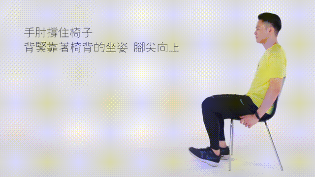 動作要領:找一個有靠背的椅子坐下,腳背微微勾起,緩慢伸直膝蓋,保持約10秒後,緩慢放下,如此重複,左右兩腿交替。如果感覺輕鬆,還可以在小腿末端綁一個重量適中的沙袋或者其他重物。
