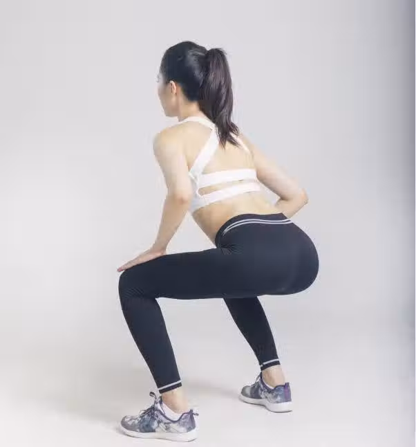 動作要領:兩腿開立與肩同寬,屈膝下蹲,想像屁股後面有凳子要坐上去,儘自己最大能力深蹲,背部挺直儘量和小腿處於平行,大腿儘量和地面平行,注意膝蓋與腳尖的位置均向前,膝蓋不要內扣,激活臀部和大腿前側。