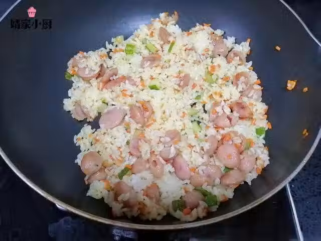 雞蛋,調料汁充分的炒勻,此時嘗一下鹹淡,每個人的口味都不一樣,淡口的,此時的鹹淡應該就可以了;重口的,可能還要加點鹽,我自己這種不咸不淡的就加了1/2小勺的鹽感覺剛剛好,這是參考,大家還是要看自己的實際情況來加鹽,畢竟香腸也是有鹹味的。
