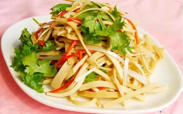 做法:豆皮,黃瓜,胡蘿蔔都切絲。水開了放豆皮絲,胡蘿蔔絲,燙熟即可。焯水的豆皮和胡蘿蔔,冷開水渡涼。香菜梗留下,蒜和香菜葉子砸碎。