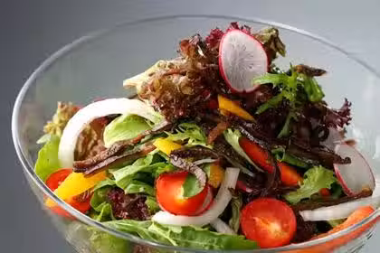3、取大碗,放入豆腐絲、黃瓜絲、紅椒絲、洋蔥絲、香菜拌勻