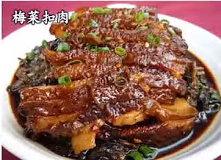 材料:帶皮五花肉1000克,梅幹菜200克,醬油20克,清油1000克 做法: 1.把豬肉的肉皮刮洗幹凈,放入冷水鍋中,上火煮至八成熟,撈出用凈布擦去肉皮上的水分,趁熱抹上醬油。2.鍋上火,倒入清油,燒至八成熱,將五花肉皮朝下放入鍋中炸至呈深紅色,撈出晾涼,皮朝下放在砧板上,切成7厘米長、2厘米厚的大片,中要把皮切斷。3.將肉皮朝下整齊地碼在碗內,肉上放梅幹菜,均勻倒入醬油。4.入蒸鍋蒸約30分鐘至肉軟爛,取出扣在盤於裏。