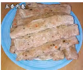 材料:花肉(去皮切碎)800克,紅蘿蔔(切碎)半條,香菇(浸軟切碎)6朵,沙葛(切碎)200克,蔥蒜(攪碎)各10粒,蘇打餅(壓碎)5片,青蔥(切碎)1棵,豆皮1張 調味料:五香粉1茶匙,胡椒粉1茶匙,蠔油1湯匙,糖半湯匙,鹽2茶匙,雞精粉半茶匙,蛋1個,薯粉2湯匙,麻油半湯匙,花雕酒1湯匙 做法: 1.把全部材料和調味料混合用手攪拌均勻。2.把揉碎鋪在豆皮上捲起,塗上薯粉水在介面處,捲起。3.兩端的開口處塗上薯粉水折起。4.大火蒸20分鐘至熟即可。5.要吃時,再炸至金黃色即可。