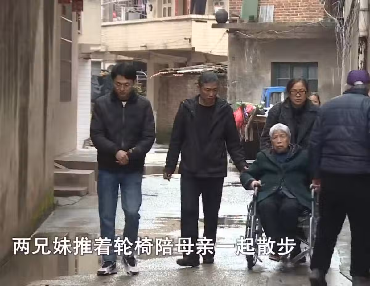 兄妹在村幹部的見證下簽訂協議,兩人握手言和,並一起回到家裡,推著母親散步。