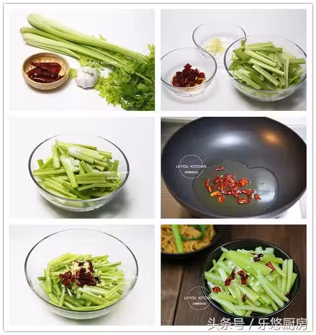 第六步:往芹菜中放入半勺雞精、3勺醋、少許香油拌勻即可裝盤上桌。