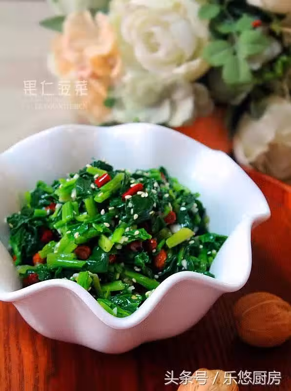 第一步:準備食材。主料:新鮮菠菜一小把、花生小半碗。輔料:熟白芝麻適量、蒜少許、干辣椒幾個。