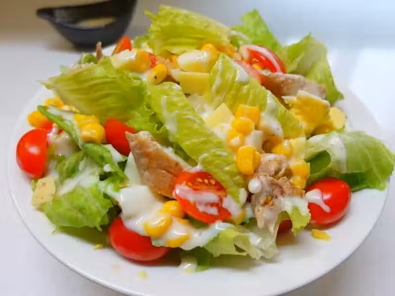 2.蘿蔓生菜葉撕小片,與其它蔬菜一起裝碗。
