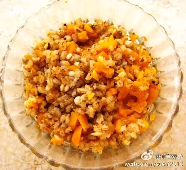 材料:南瓜半斤、糙米飯半碗(煮熟)、香菇5朵、油2大匙、 姜1小片、青豆仁1匙、綜合堅果(含南瓜子、葵瓜子、枸杞子等)適量