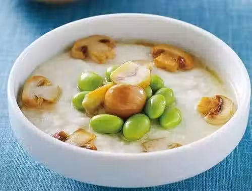 3.接著將松茸菇和栗子片排在上面,放入蒸籠內,以小火蒸約10分鐘取出,放上燙熟青豆仁裝飾即可。