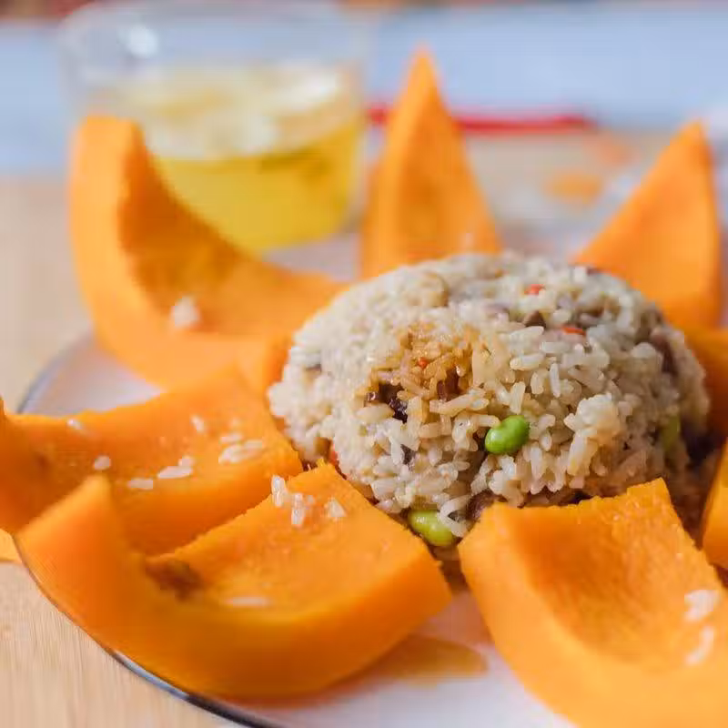 南瓜500克,糯米50克,紅糖20克,大棗2個,青豆10顆,香菇1小瓣,枸杞10顆
