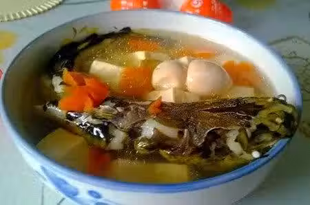 食材:黃甲魚300g、豆腐150g、生薑15g、鹽適量、紅蘿蔔80g、鵪鶉蛋45g、胡椒粉適量