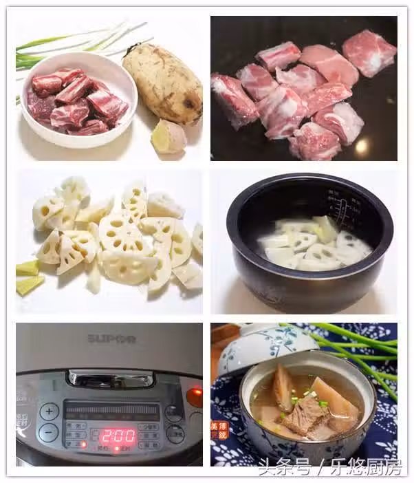 第四步:將排骨、蓮藕、薑片一起放入電飯鍋中,再倒入1000毫升溫水。