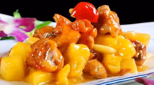 食材:雞肉,菠蘿,食用油,鹽,糖,料酒