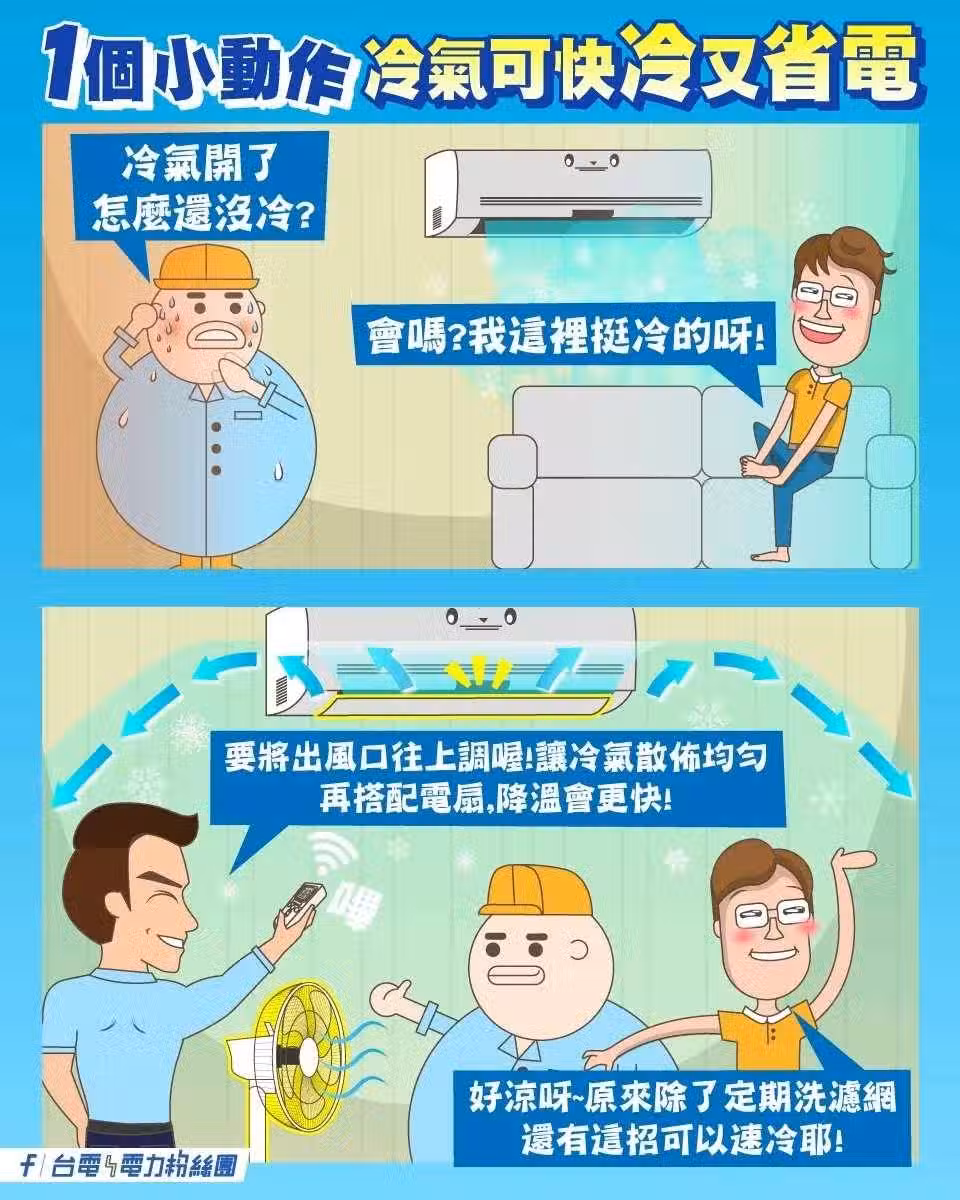 [3/5] 台電解釋,這是因為熱空氣上升、冷空氣下降,在冷氣製冷時出風口朝上,送出的冷空氣會往下沉,能讓冷空氣的散布更均勻,室內降溫就可以更快。若搭配電風扇或循環扇使用,也更提升室內空氣循環流通的速度,讓室內空間冷更快,就能讓冷氣壓縮機減少運轉時間來省電。