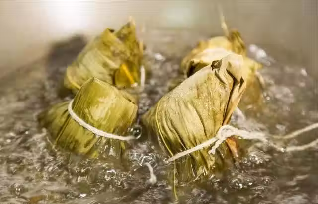 通過使用溫水煮粽子,可以確保粽子受熱均勻,內外熟度一致。此外,溫水也能更好地幫助粽子吸收水分和香料的味道,使粽子更加美味。鍋中的粽子慢慢變得飽滿而有彈性,糯米散發出誘人的香氣,與大棗的甜味融合在一起,令人無法抵擋。煮粽子的過程是一個等待和期盼的過程,每當香氣瀰漫開來,都讓人感受到端午節的濃厚氛圍。