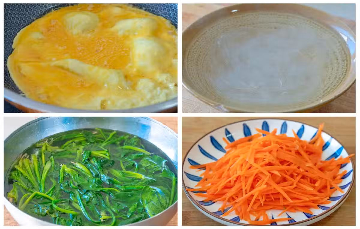 4、接著把菠菜擠干水分裝入碗里,加胡蘿蔔、粉絲、雞蛋、花生米,再來調個醬汁:白芝麻、蒜末、熱油、生抽、香醋、辣椒油、鹽、糖,攪拌均勻後直接淋到菠菜的碗里,翻拌均勻後就可以開吃了,好吃的涼拌菠菜就做好了。
