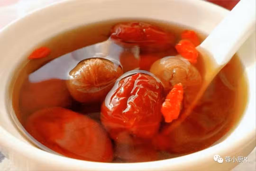 5、茶喝完之後,剩下的配料也不要浪費,桂圓吸飽了水分特別好吃,肉質柔韌中帶有點嚼勁,紅棗吸飽了水分,咬上一口,甜甜的還爆汁。