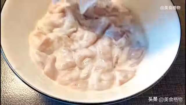 最開始的時候,也就是前兩三次,我們用手使勁的抓揉,之後的幾次,看到肉慢慢從這種粉紅色變得有點發白的顏色,我們就轉著圈的使勁摔打它,讓它把水分全部吸收進去。用這樣的方法不僅可以讓肉吸收水分,同時可以讓肉保持一點點上勁,這樣肉不會太鬆散失去口感。看一下我們加了三四次水,現在這肉片的顏色已經明顯的白了很多,而且通體感覺像是半透明一樣。這樣做的肉片不管是炒著吃,煎著吃或者是直接涮火鍋都會比較好。