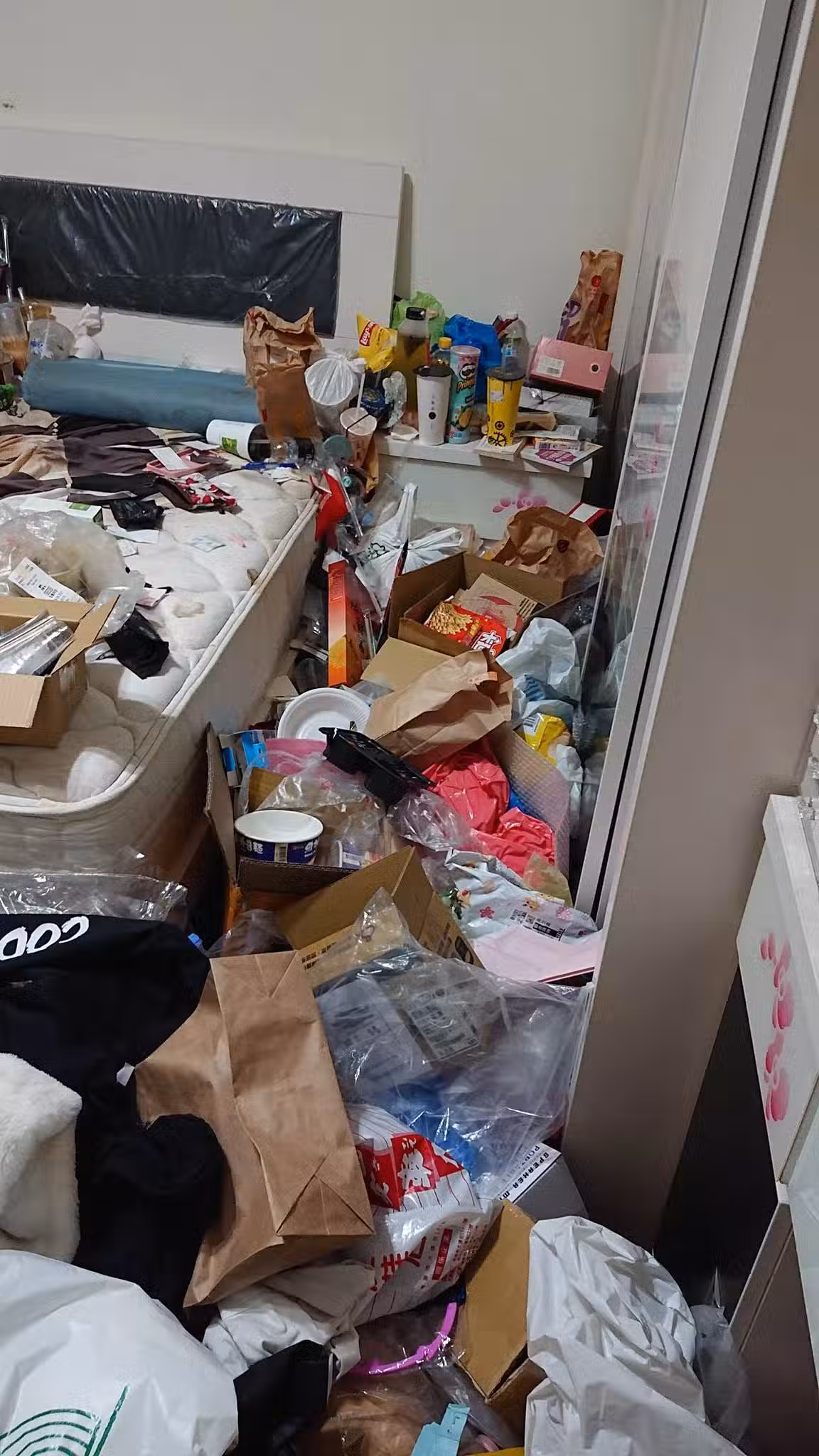 照片中,不論是床上、地上還是櫃子上,全都堆滿垃圾和雜物,且已經完全看不見地面,沒喝完的飲料和吃完的泡麵空碗,在床頭櫃上推成了一座小山,地上不僅有紙袋、塑膠袋,還有許多衣服、娃娃、用過的衛生紙和垃圾,床上亂七八糟的東西也已讓人分不清是私人物品還是雜物。