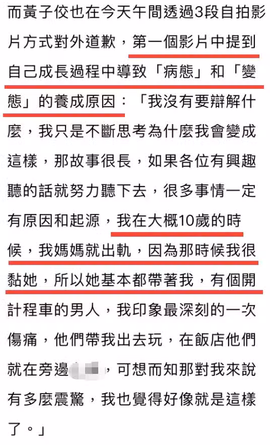 提到當時對女孩的傷害,黃子佼承認自己當時有變太的心理,同時也透露自己變成這樣的原因是來自原生家庭導致,他的母親在他10歲的時候出軌,而後在他的面前和另外的男人親密,這件事讓他極受刺激。 而後他的內心開始慢慢扭曲,甚至和男同學有親密互動,也一度懷疑自己是否喜歡男生,就是因為這樣的成長環境,導致黃子佼做出了侵犯女生的舉動,這件事也成了他永遠抹不去的污點。