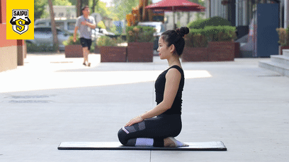 注意事項:這個動作是拉伸大腿的最長見的動作,兩腿和膝蓋併攏,臀部坐在腳後跟上,腳背著地。
