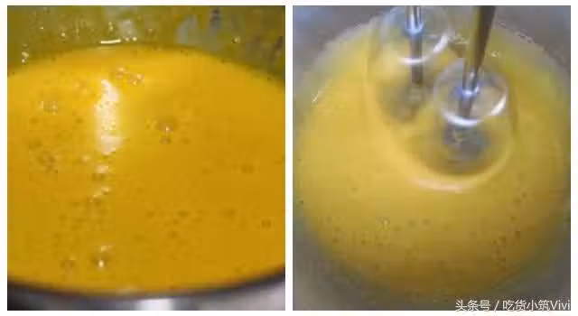 4、繼續中高速攪打蛋黃,蛋液慢慢變得濃稠,色澤轉為淺黃色。如提起打蛋器,蛋液會快速流下。