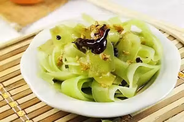 1、萵筍去掉老皮,取比較嫩的部位,大蒜去皮,剁成蒜茸;嫩萵筍用刮皮刀,刮出條狀