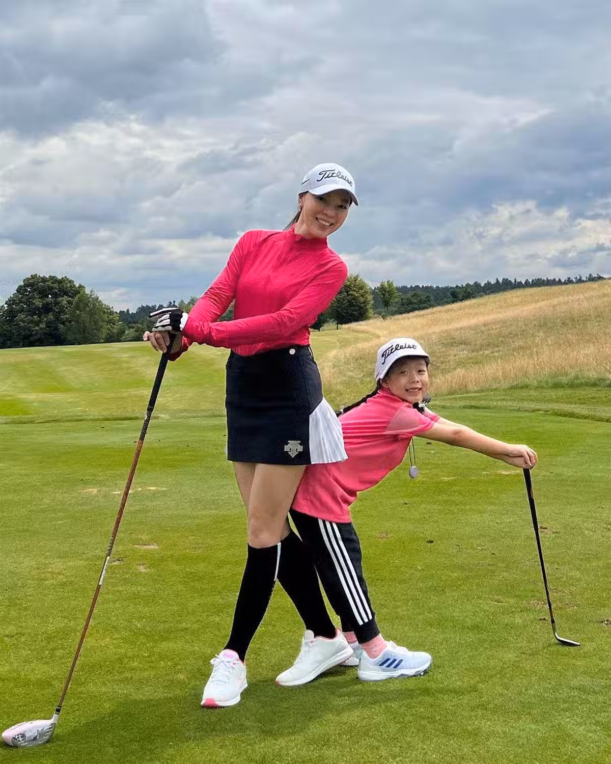 47歲鴻海老闆娘國外度假「打高爾夫」,穿萬元短裙秀美腿,身材苗條似少女,「6歲小女兒」神似老爸郭台銘