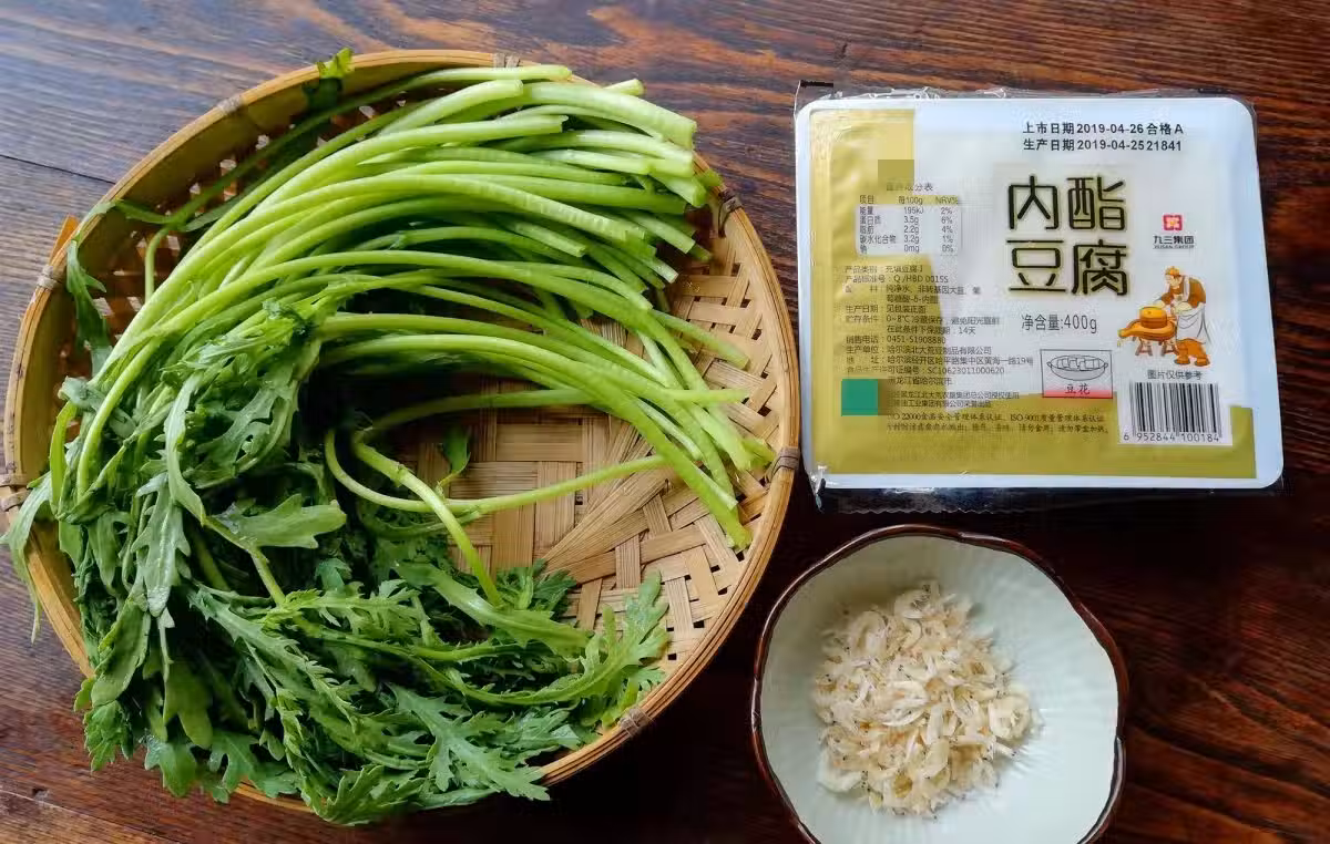 1.準備好所需材料,茼蒿擇去老葉,掐去根部,投洗乾淨